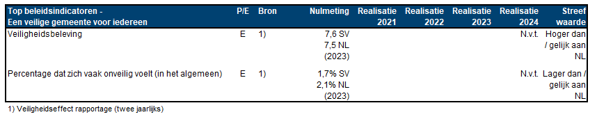 Uit de nulmeting in 2023 blijkt dat we voldoen aan de streefwaarde. In 2025 is het eerst volgende meetmoment na de nulmeting in 2023. De Veiligheidseffectrapportage 2024 geeft inzicht in de mate waarin de uitkomst van de meting in lijn is met de streefwaarde. Er zijn veel andere zaken die het veiligheidsgevoel kunnen beïnvloeden. Denk aan zaken in de persoonlijke levenssfeer, gebeurtenissen in de regio, landelijk of zelfs mondiaal. Ook is de kwaliteit van de fysieke leefomgeving een belangrijke determinant van het veiligheidsgevoel. De topindicatoren zijn geen doel op zich. We volgen vooral de ontwikkeling van de verschillende indicatoren. Op grond van de Veiligheidseffectrapportage beoordelen we of bijsturing of bijstelling van beleid nodig is.
